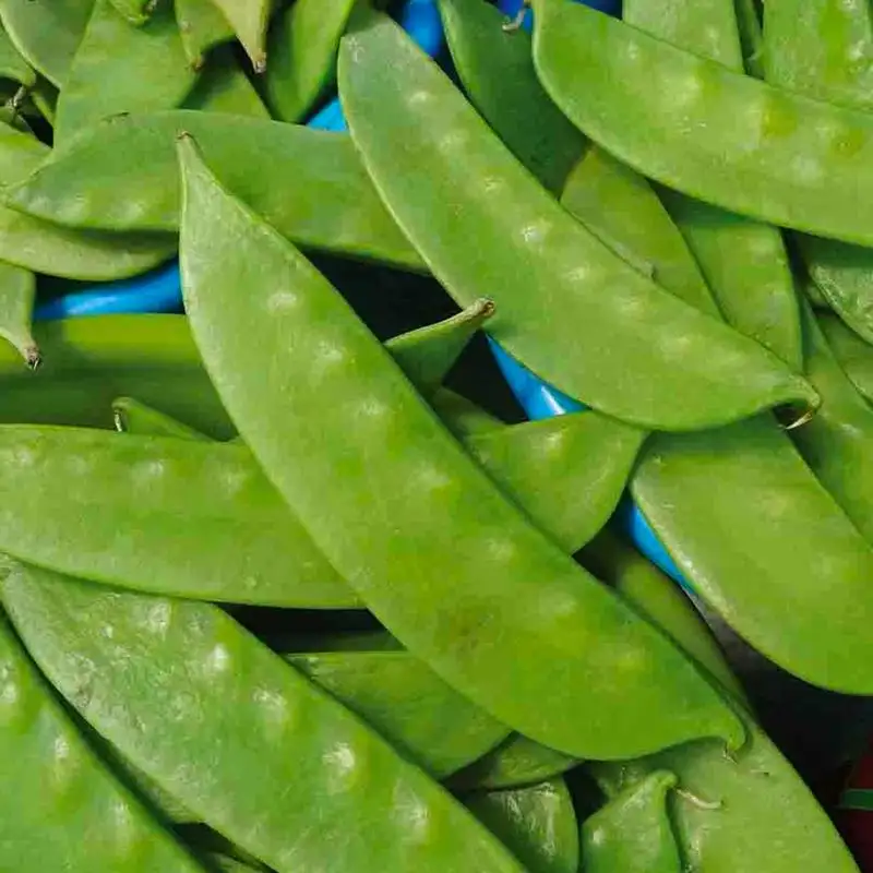 Vines are about 54″ tall. Pods are 5″ long, broad, flat, fleshy and free from strings. About 8 to 10 peas per pod. Seeds are large, round and a creamy white color.