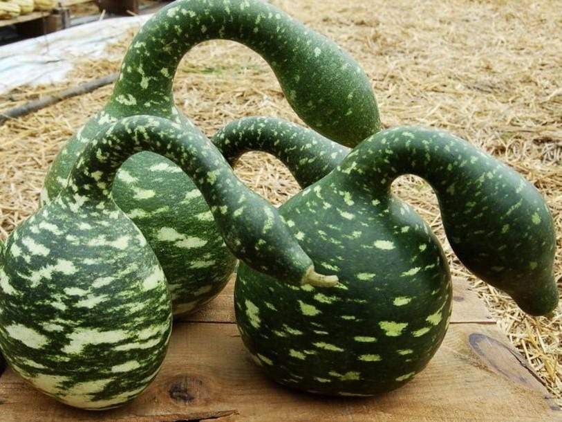 A unique looking large gourd with a round body and a long curved neck. A small bulb at the stem end gives a good resemblance of a “swan’s head”. Gourds grow 14 to 18 inches long with a 6 to 8 inch diameter base.